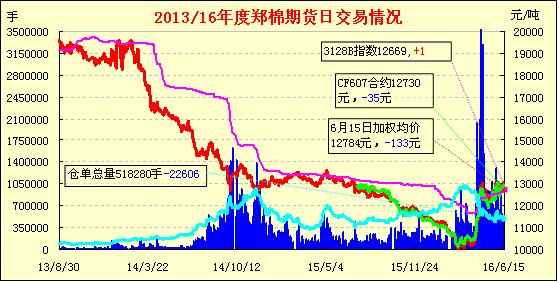 6月15日,隔夜鄭棉探低回升,今日早盤沖高后在空頭賣盤壓制下回落,日線形成陰線星。日內(nèi)成交量變化不大,持倉量近減遠(yuǎn)增。基本面情況:據(jù)了解,包括新疆生產(chǎn)建設(shè)兵團在內(nèi)2015/16年度疆內(nèi)皮棉銷售進度已達到90%以上,各軋花廠、疆內(nèi)經(jīng)營商手中的原料庫存寥寥可數(shù),而且剩余皮棉品質(zhì)較低,不符合紡C32S及以上支數(shù)棉紗的配棉需要;再加上國儲棉輪出資源“低、中、高”等級全覆蓋,棉企報價又大幅高于國儲棉競賣價格500-800元/噸,因此現(xiàn)貨成交非常冷清。河南、山東、河北等地的一些中小紡企表示,雖然2012、2013年度國儲棉新疆棉、地產(chǎn)棉顏色有所降級,但纖維長度、馬值、斷裂比強度等紡紗指標(biāo)卻明顯好于疆內(nèi)外倉庫剩余的2015/16年度現(xiàn)貨,紡C32S及以下支數(shù)機織紗(白坯布,批染色)質(zhì)量比較穩(wěn)定,下游面料、服裝廠家反響較好。江浙、廣東等地棉紗經(jīng)銷商表示,6月份以來OE紗、C21S、C32S等低支紗的詢價和出貨仍明顯好于高支普梳紗、精梳紗。