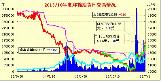 7月1日,隔夜鄭棉盤整,今日早盤在多頭平倉(cāng)打壓下走低,隨后在空頭回補(bǔ)與多頭買盤推動(dòng)下反抽,午后窄幅震蕩,日線形成陰線星。日內(nèi)成交量萎縮,持倉(cāng)量減少?;久媲闆r:自6月18日以來,安徽省安慶棉區(qū)連續(xù)遭受強(qiáng)降雨襲擊,尤其宿松縣遭遇1983年以來最強(qiáng)降雨。全市40多萬畝棉田都不同程度受到雨水的影響,部分棉田甚至造成絕收。