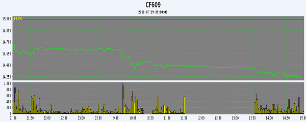 7月29日,隔夜鄭棉盤整,今日早盤增倉下跌,隨后在空頭賣盤與多頭平倉盤壓制下震蕩下滑,終盤收于跌停,日線形成陰線。日內(nèi)成交量萎縮,持倉量減少。基本面情況:來自中國紡織協(xié)會的一則“國儲棉輪出將延期至9月底”的消息再次攪動了棉紡織廠、貿(mào)易商及其它各機構(gòu)的神經(jīng),“如果每天維持3萬噸左右的輪出量,多一個月相當(dāng)于2015/16年度國儲棉輪出量增加60多萬噸,對‘等米下鍋’且棉紗、坯布產(chǎn)銷‘倒掛’的紡織企業(yè)而言是個‘雪中送炭’式的利好”。“傳言”一經(jīng)出臺,28日國儲棉競拍平均成交價、“二次”上市銷售的2012/2013年度國儲棉報價均大幅下滑,幅度都在500-600元/噸;部分前期大量囤棉的貿(mào)易商開始“開閘放糧”,市場供應(yīng)量不斷回升。7月29日,2012、2013年度“13”“22”“23”級新疆兵團棉報價14500-15000元/噸(公定結(jié)算,倉庫提貨,出庫費買方自理);而國儲地方企業(yè)加工的皮棉報價則低200-300元/噸。