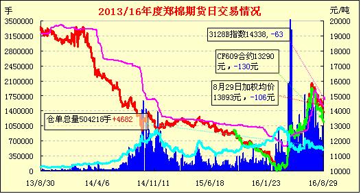 8月29日,隔夜鄭棉沖高回落,今日早盤放量下滑,隨后在空頭回補支撐下反彈,此后盤跌下行,日線形成陰線。日內(nèi)成交量萎縮,持倉量增加。基本面情況:北疆有棉農(nóng)向筆者透露,其種植的機采棉單產(chǎn)預期在200多公斤,如果收購價格在5.5元/公斤以上,算上目標價格的預期尚有盈利,但如果收購價格低于該水平則心里沒底。相比下來,某南疆種植手摘棉和長絨棉的農(nóng)戶表示,其單產(chǎn)超過350公斤,如果不算上補貼,收購價格能達到6.3元/公斤則能保本了。