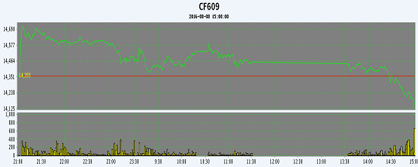 8月8日,隔夜鄭棉沖高調整,今日早盤反彈,午后下跌收于日低,日線形成陰線。日內成交量萎縮,持倉量減少?;久媲闆r:7月28日以來鄭棉與國儲棉輪出成交均價振蕩下跌,2015/16年度棉花現(xiàn)貨和“二次”上市的國儲棉不僅報價持續(xù)下跌,而且成交量也有所下滑,河南、湖北、江蘇等地甚至再現(xiàn)“有價無市”的窘境。一方面貿易商6月中旬以后競拍的國儲棉價位普遍偏高,特別是7月18-7月27日,國儲棉日均成交價達到15000-15500元/噸,近幾日已回調600-800元/噸,貿易商經營利潤受到很大壓縮,高價高等級國儲新疆棉甚至沒有利潤或小幅虧損;另一方面部分囤棉數(shù)量較大的貿易商認為國儲棉輪出延長一個月仍處于“傳言”狀態(tài),相關部門并未明確出未出公告,即使10月下旬新棉大量上市前增加60多萬噸國儲棉拋售量,對整個供需市場的影響并不很大,一些棉商、投機商的反應過度,當前下跌主要是貿易商相互“踩踏”造成的。