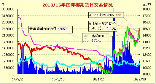 9月30日,隔夜鄭棉盤整,今日早盤在多頭平倉打壓下走低,隨后空頭回補(bǔ)買盤推動期價回升,日線形成小陽線。日內(nèi)成交量萎縮,持倉量減少?;久媲闆r:截止9月底,石河子、五家渠、沙灣等地籽棉采摘進(jìn)度已超過20%,有少量中期花交售,一些農(nóng)民表示,9月中下旬北疆降雨較大、氣溫尚可,因此抓緊時間拾花。據(jù)天氣預(yù)報(bào)預(yù)測,十月一日起奎屯、石河子、塔城等大部地區(qū)將迎來一輪持續(xù)時間比較長的降雨,氣溫也隨之下降5-8度,將給棉花采摘工作帶來比較大的影響?!?/p>