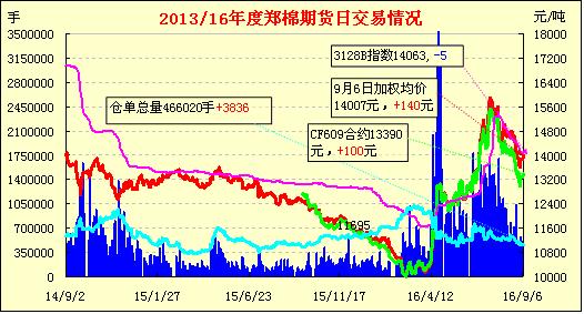 9月6日 增倉放量,重心上移。基本面情況:棉花已經進入到了“金九銀十”的傳統(tǒng)旺季,可棉花市場卻表現不是很積極,顯得萎靡不振。最近,新疆以及黃河長江流域棉區(qū)成熟較早的棉花已經開始陸續(xù)吐絮,少量籽棉上市。前期降雨以及干旱情況,對新棉采摘進度及棉花質量略有影響。不過未來一周,國內棉花主產區(qū)基本以晴好天氣為主,溫度適宜,對棉花的后期生長較為有利。