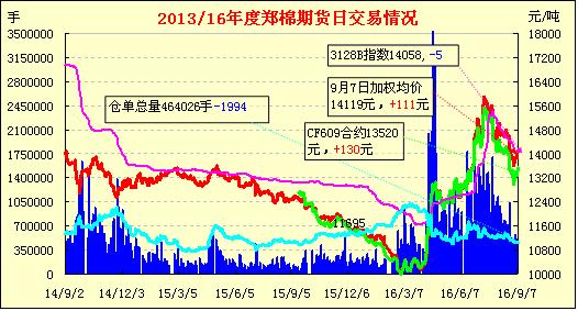 9月7日,隔夜鄭棉增倉上行,今日上午盤持倉量下行,鄭棉回調(diào);午后整體呈現(xiàn)橫盤震蕩,持倉量開始有所上升,日線走出小十字星。日內(nèi)持倉增加,成交量縮?;久媲闆r:中國棉花價(jià)格指數(shù)3128B棉報(bào)14063點(diǎn),下跌5點(diǎn),儲(chǔ)備棉投放成交27096余噸,成交比例90.20%,成交均價(jià)13249元/噸,成交比例大增,成交均價(jià)小幅上漲,新疆一些地區(qū)開秤收購,機(jī)采棉達(dá)到6.50-6.70元/公斤,手采棉加價(jià)0.20-0.30元/公斤,一些開機(jī)早的棉企已對(duì)外銷售皮棉。儲(chǔ)備棉競(jìng)拍量?jī)r(jià)齊升顯示市場(chǎng)有所向好,也對(duì)期現(xiàn)貨價(jià)格有積極影響。