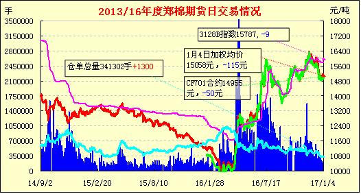 1月4日,隔夜鄭棉CF1705合約下滑,今日早盤在多頭買盤和空頭回補的推動下回升,午后窄幅震蕩,日線形成長下影線的陰線星。日內(nèi)成交量放大,持倉量增加?;久媲闆r:目前,距離春節(jié)還有三周的時間,河北的棉花企業(yè)經(jīng)營現(xiàn)呈兩極分化狀態(tài)。現(xiàn)貨銷售速度有所減緩,行情近幾日保持了弱勢穩(wěn)定態(tài)勢。1月3日,籽棉收購主流價格在3.70--3.80元/斤(衣分率38%,回潮率13%)。進入收購后期,籽棉顏色級有所下降,其他質(zhì)量指標(biāo)較好。據(jù)了解,當(dāng)前棉花企業(yè)收購狀態(tài)截然不同,部分中小型棉企停止了籽棉收購工作,場區(qū)皮棉庫存數(shù)量也較少,但個別大型棉企則繼續(xù)籽棉收購工作。他們認(rèn)為隨著春節(jié)的臨近,一方面堅持收購的棉花企業(yè)數(shù)量逐漸減少。另一方面部分棉農(nóng)有節(jié)前出售籽棉的習(xí)慣。因此,當(dāng)前繼續(xù)收購可適當(dāng)降低收購成本,但日收購數(shù)量呈下降趨勢,企業(yè)收購比較謹(jǐn)慎,對于質(zhì)量較差的籽棉壓低價甚至拒收。