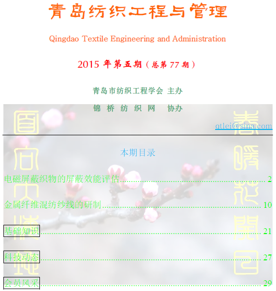 由青島市紡織工程學(xué)會(huì)主辦、錦橋紡織網(wǎng)協(xié)辦的《青島紡織工程與管理》電子期刊于2009年1月正式創(chuàng)刊。該刊由青島市紡織工程學(xué)會(huì)秦志強(qiáng)工程師任主編。該刊除以電子郵件形式發(fā)送至?xí)T單位外,還在錦橋紡織網(wǎng)開設(shè)專門窗口供業(yè)內(nèi)人士進(jìn)行瀏覽與查閱。該刊的創(chuàng)辦定能為廣大紡織業(yè)技術(shù)人員提供1個(gè)技術(shù)交流平臺(tái),為我國紡織業(yè)技術(shù)創(chuàng)新起到積極作用。