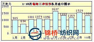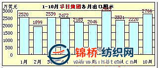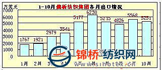 從該10家企業(yè)出口總體情況看,服裝、家紡類企業(yè)出口相對穩(wěn)定或較大幅度增長,棉紡織企業(yè)出口則不同程度下降。如1-10月,魏橋紡織集團(tuán)同比下降40.23%、臨清三和紡織集團(tuán)同比下降26.23%、魯泰紡織股份有限公司基本持平,微增0.93%等。但從棉紡織企業(yè)月度出口額矩形圖上看,自6月份開始,棉紡織企業(yè)出口業(yè)績開始出現(xiàn)穩(wěn)步提升跡象,在情況稍見好轉(zhuǎn)的同時,10月份又出現(xiàn)不同程度回落。該10家企業(yè)前10個月的月度出口圖示如下(按出口額大小排列):