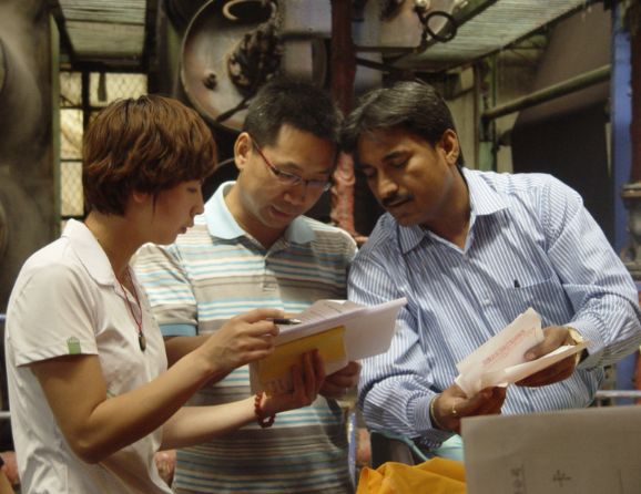 目前,河北寧紡集團正與美國Nano-Tex公司合作開發(fā)納米整理系列新品。圖為Nano-Tex公司印度地區(qū)技術經理Anand Rawat(右)與寧紡技術人員在生產現場研究新品工藝。