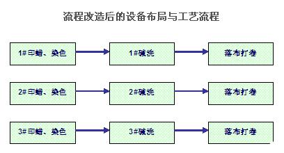 實(shí)施流程再造,打破原有設(shè)備布局的塊塊管理,按生產(chǎn)工藝流程實(shí)行條條管理,將原來(lái)的單元機(jī)改造為聯(lián)合機(jī),堿洗下機(jī)直接打卷。新流程打破了傳統(tǒng)方式和生產(chǎn)組織,必須以新的更精細(xì)的工藝條件,更精確的流水節(jié)拍,更精準(zhǔn)的供需平衡。公司在化料工序,改變?cè)瓉?lái)各機(jī)臺(tái)獨(dú)立化料各自使用的分散管理方式,采用“染料廚房”管理理念,集中化料,統(tǒng)一分配。企業(yè)通過(guò)改造、升級(jí)裝備水平、應(yīng)用企業(yè)自主研發(fā)的熱水退蠟節(jié)能成果、不斷調(diào)整改進(jìn)工藝、解決改造中遇到的新問(wèn)題。其中,染色設(shè)備由于烘干效率低,成為流程再造制約機(jī)臺(tái),經(jīng)過(guò)工程技術(shù)人員攻關(guān)最終予以解決,從而取得蠟染工段流程再造工程的成功。改造后的聯(lián)合機(jī)有著顯著優(yōu)勢(shì):