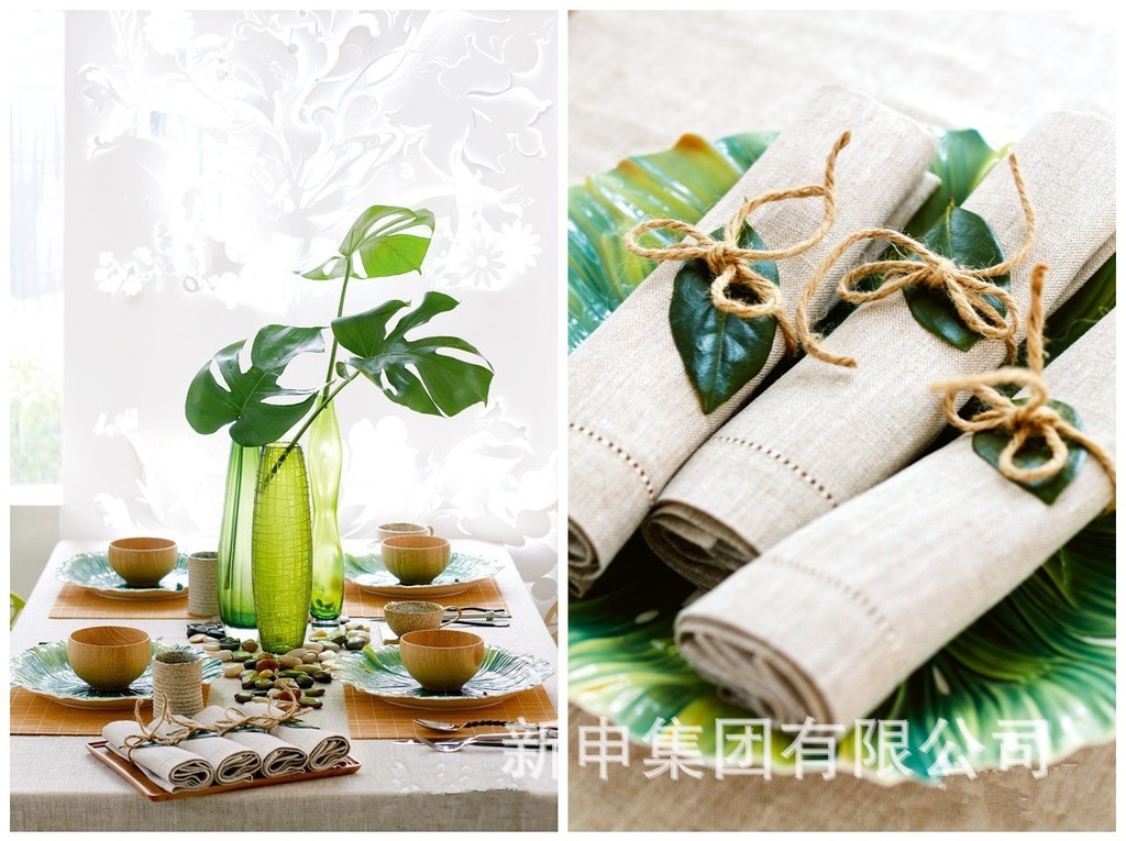 其中選取的這樣的自然風格餐桌的布置,凸顯出餐桌文化取意于自然主義文化:綠色、白色、沙土色都是自然最本真最常見的顏色,而對于自然元素的選材采用了:亞麻、原木、竹子、綠葉,甚至鵝卵石等自然之物。給人一種清新雅致的舒適感,仿佛置身于熱帶雨林的叢林野餐,呼吸吐納間都包容著自然的氣息?! ?/p> 特別值得一提的是其中的亞麻布元素,眼前的亞麻桌布與亞麻餐巾清新別致,饒有一番風味,對比白金漢宮皇家寓言中繡上女王名字的華麗餐巾和拼接的高檔亞麻桌布的富麗堂皇又增添了一份平民時尚,高雅的陳設烘托出一種“出世入世”的清新淡雅、無欲無求的順其自然的心境,古典中禪意朦朧。新申亞麻面料專家品讀眼前的餐桌文化,讀出了源自自然文化下的亞麻文化。