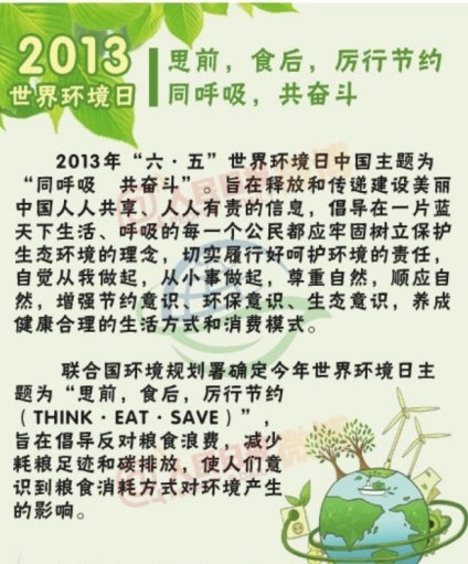 6月5日,世界環(huán)境日。1972年6月5日,聯(lián)合國在瑞典首都斯德哥爾摩舉行了第一次人類環(huán)境會議,通過了《人類環(huán)境宣言》及保護全球環(huán)境的“行動計劃”,并正式將6月5日定為“世界環(huán)境日”。今年環(huán)境日的主題是“思前,食后,厲行節(jié)約”,旨在倡導反對糧食浪費,減少耗糧足跡和碳排放,使人們意識到糧食消耗方式對環(huán)境產(chǎn)生的影響?! ?/p>