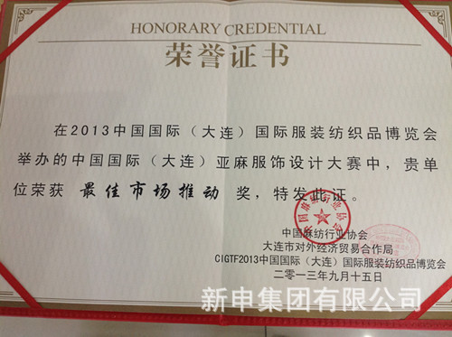 由中國麻紡行業(yè)協(xié)會、歐洲亞麻大麻聯(lián)合會、大連市人民政府外經(jīng)貿(mào)局聯(lián)合主辦,新申集團(tuán)、大連工業(yè)大學(xué)聯(lián)合承辦的2014-2015春夏新申亞麻流行趨勢發(fā)布會暨“茶為媒”孫林亞麻專場發(fā)布、2013中國國際(大連)亞麻服飾設(shè)計大賽、首屆中國(大連)國際亞麻時尚高峰論壇在大連第二十四屆中國國際服裝紡織品博覽會國際亞麻時尚大會中成功舉辦。