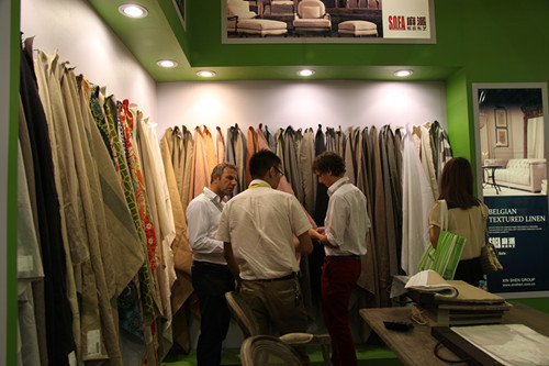 在上海家紡展期間與國(guó)外客戶洽談亞麻面料