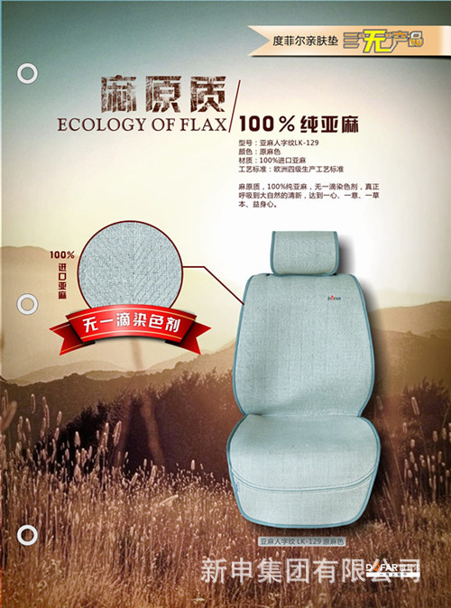 新申集團(tuán)自主設(shè)計(jì)、研發(fā)、生產(chǎn)的100%純亞麻汽車(chē)坐墊、座椅、座套面料,深受?chē)?guó)際國(guó)內(nèi)汽車(chē)消費(fèi)市場(chǎng)的青睞。究其原因,亞麻面料夢(mèng)想家——新申常年從法國(guó)諾曼底進(jìn)口頂級(jí)的天然亞麻纖維原料,同時(shí)通過(guò)歐洲先進(jìn)的紡紗、織造工藝,并成功與意大利時(shí)尚設(shè)計(jì)相結(jié)合,生產(chǎn)出優(yōu)質(zhì)的純亞麻汽車(chē)墊、座椅、座套亞麻面料。
