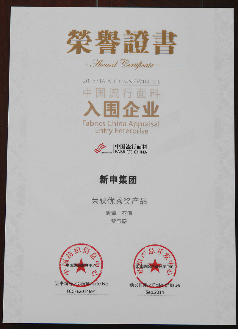 2014年2月,新申集團(tuán)被中國麻紡行業(yè)協(xié)會(huì)授予“中國麻紡織行業(yè)管理創(chuàng)新先進(jìn)企業(yè)”;5月,新申亞麻品牌榮獲“中國麻紡行業(yè)十大影響力品牌”。新申對(duì)于亞麻面料事業(yè)的專心、專注、專業(yè),通過產(chǎn)業(yè)鏈的打造,通過面料的創(chuàng)新設(shè)計(jì),以一體化成品展示面料,引領(lǐng)客戶設(shè)計(jì)時(shí)尚潮流。不僅常年醉心于設(shè)計(jì)、研發(fā),產(chǎn)業(yè)轉(zhuǎn)型,模式創(chuàng)新,更是一直堅(jiān)持過硬品質(zhì)是企業(yè)發(fā)展的生命線,在品質(zhì)方面始終如一,絲毫不敢有所懈怠。無論過去、現(xiàn)在還是未來,新申亞麻在充分利用國際國內(nèi)兩種資源,進(jìn)軍國際國內(nèi)兩大市場的前提下,為自身設(shè)立了三大硬性指標(biāo):一是設(shè)計(jì)、研發(fā)在亞麻面料領(lǐng)域持續(xù)的創(chuàng)新能力;二是整個(gè)產(chǎn)業(yè)鏈的不斷完善、過硬的品質(zhì)保證;三是終端市場不斷細(xì)分的占有率。新申亞麻以強(qiáng)大而完善的技術(shù)創(chuàng)新體系和嚴(yán)格的面料產(chǎn)品品質(zhì)為支撐,以此來服務(wù)客戶和消費(fèi)者!