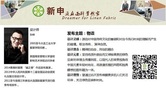 設(shè)計師孫林在接受記者專訪時,透露了此次“物語”主題的一些設(shè)計靈感和創(chuàng)意構(gòu)思。他表示:“此次發(fā)布會主題靈感源自對中國傳統(tǒng)文化的眷顧和對當今流行時尚的理解而產(chǎn)生的碰撞。取法傳統(tǒng)、演繹自然,以‘精神的自由,民俗的融合’為設(shè)計理念,堅持將質(zhì)樸脫俗而又神秘高貴的綠色亞麻環(huán)保理念傳播到底,以現(xiàn)代人的審美視角將中國元素年輕時尚化,將浪漫優(yōu)雅的風格和獨具臆想的圖形融為一體。以別出心裁的亞麻面料創(chuàng)意設(shè)計,獨具匠心的裁剪,打造出今季復古、時尚、魔幻、自由的新世界,將人與自然和諧統(tǒng)一的意境融合得恰到好處。”同時設(shè)計師還希望通過此次發(fā)布喚醒更多的人們關(guān)注環(huán)保,關(guān)注綠色亞麻新時尚。匯集中式傳統(tǒng)與流行時尚的“物語”絕對值得期待!