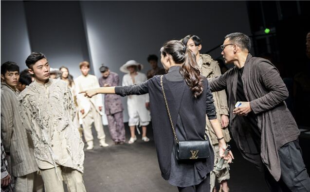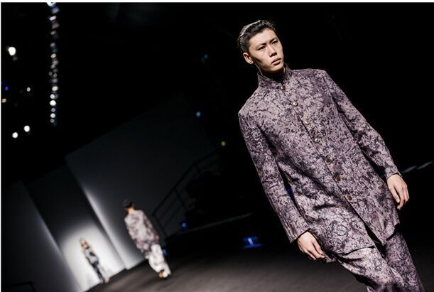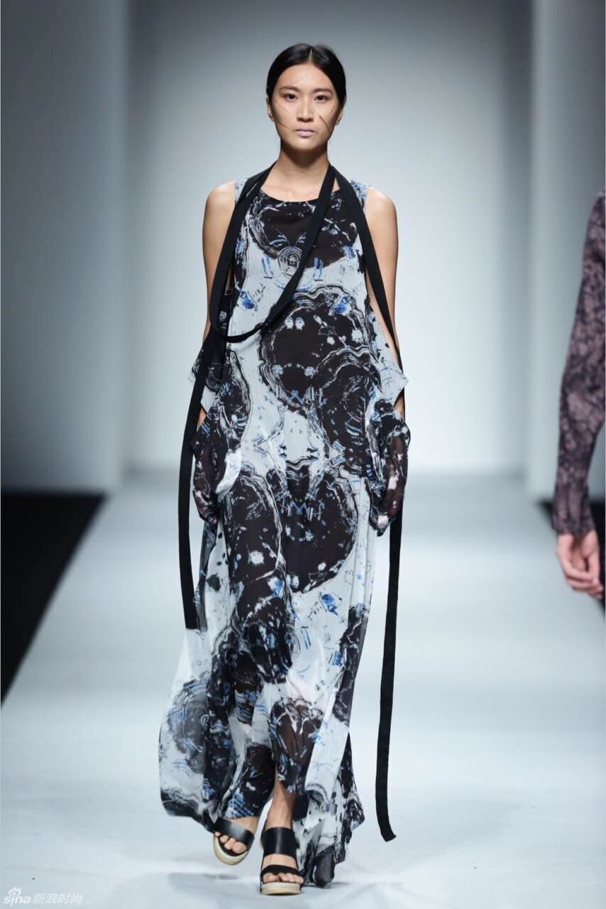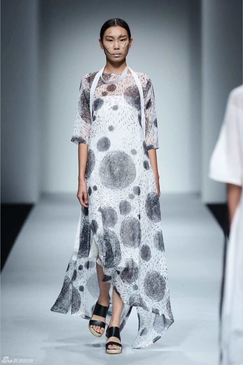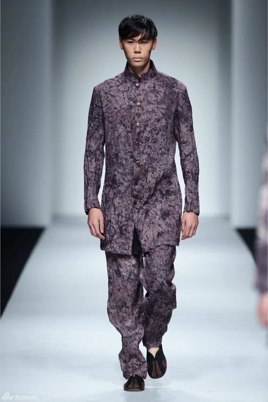 在本場(chǎng)秀中,設(shè)計(jì)師在面料的選擇與使用方面近乎苛刻,對(duì)每張圖稿的設(shè)計(jì)之初就開(kāi)始對(duì)面料應(yīng)用性能進(jìn)行研究,并在樣衣的制作過(guò)程中對(duì)亞麻面料進(jìn)行大膽嘗試。設(shè)計(jì)師在緊扣季節(jié)性特點(diǎn)的基礎(chǔ)上將棉、紗、雪紡、皮革等材料大膽和亞麻相結(jié)合。色彩上采用主流的中性色調(diào)來(lái)貫穿整場(chǎng)秀,米色、卡其色使整體設(shè)計(jì)顯得柔和、干凈,咖啡色和黑色帶來(lái)精美的組合。清新的亞麻色和灰色調(diào)的原創(chuàng)數(shù)碼印花為天然粗獷的織物結(jié)構(gòu)增添了時(shí)尚紋理,通過(guò)改良式的新中式服裝和隨意簡(jiǎn)潔的外套成為整場(chǎng)秀的亮點(diǎn)。在工藝處理上設(shè)計(jì)師利用扎染、吊染、套染等純手工植物染色將色彩從亮色到暗色的過(guò)度呈現(xiàn)出不同層次的色調(diào),讓整個(gè)系列看起來(lái)統(tǒng)一多變而富有節(jié)奏和變化。在本季的發(fā)布秀中,簡(jiǎn)約利落的服飾外形成為設(shè)計(jì)師一貫堅(jiān)持的服裝廓型,在細(xì)節(jié)剪裁和制作上賦予了服裝的多變性,大廓型搭配的外套,搭配修身活葉邊袍服、翻折邊九分褲裝,讓整體造型混搭的時(shí)尚感強(qiáng)烈。