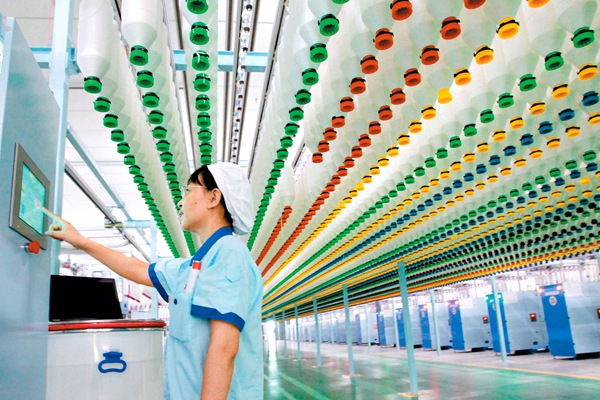 走進江蘇大生集團數(shù)字化紡織車間里(上圖),展現(xiàn)在記者眼前的是這樣一幅場景。