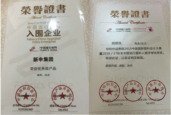 此外,一直以亞麻流行趨勢發(fā)布,亞麻面料設(shè)計、研發(fā)而聞名于紡織業(yè)界的亞麻面料夢想家——新申集團,在今年“2015中國國際面料設(shè)計大賽暨2016/17秋冬中國流行面料入圍評審”中,憑借設(shè)計師胡建良作品“麻韻”和“冰點”兩款亞麻面料設(shè)計作品再度榮獲“中國流行面料入圍企業(yè)”榮譽稱號。進一步見證了新申亞麻設(shè)計、研發(fā),推動主題化、系列化、趨勢化的亞麻面料創(chuàng)新發(fā)展的實力。