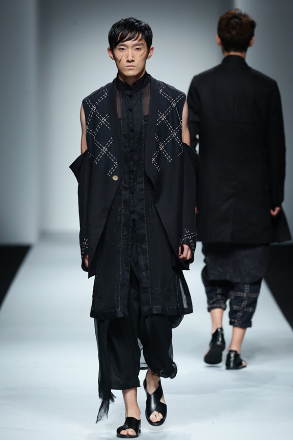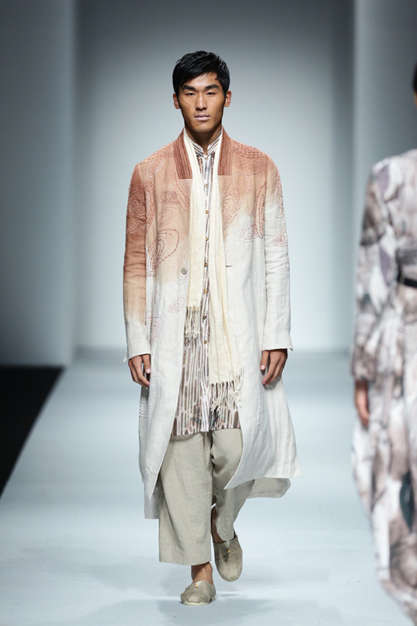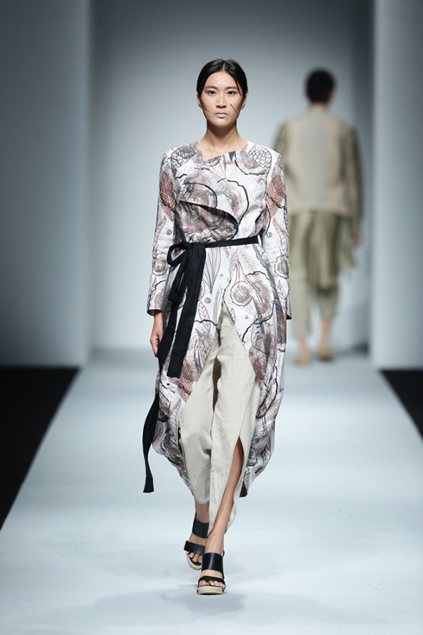 “一件服裝的設(shè)計點越多并不代表它更好,不著痕跡的設(shè)計才是好的設(shè)計。尤其是在經(jīng)濟(jì)全球化的今天,符合中國人審美的簡潔時尚設(shè)計感更容易完美的表現(xiàn)出中國人融入世界時尚的自信。”對此,孫林在面料的選擇與使用方面近乎苛刻,對每張圖稿的設(shè)計之初就開始對面料應(yīng)用性能進(jìn)行研究,并在樣衣的制作過程中對亞麻面料進(jìn)行大膽嘗試。“在緊扣季節(jié)性特點的基礎(chǔ)上將棉、紗、雪紡、皮革等材料大膽和亞麻相結(jié)合,色彩上更是大膽采用主流的中性色調(diào)來貫穿整場秀。特別是清新的亞麻色和灰色調(diào)的原創(chuàng)數(shù)碼印花為天然粗獷的織物結(jié)構(gòu)增添了時尚紋理,通過改良式的新中式服裝和隨意簡潔的外套成為整場秀的亮點。”此外,在工藝處理上,孫林還利用扎染、吊染、套染等純手工植物染色將色彩從亮色到暗色的過度呈現(xiàn)出不同層次的色調(diào),讓整個系列看起來統(tǒng)一多變而富有節(jié)奏和變化。整場發(fā)布秀,干凈優(yōu)雅系列的都市線,自然復(fù)古系列的文藝線,反叛前衛(wèi)系列的創(chuàng)意線中充分表達(dá)了設(shè)計師對自然、健康、環(huán)保、舒適生活的熱愛。特別是,簡約利落的服飾配上大廓型搭配的外套,搭配修身活葉邊袍服、翻折邊九分褲裝,讓整體造型混搭的時尚感強(qiáng)烈,贏得了滿堂彩。