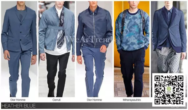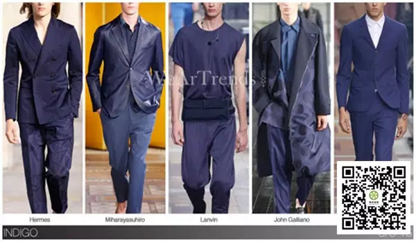 實用主義的影響激發(fā)著男裝輪廓的變化,所以色調(diào)總是保持著有橄欖綠,這種顏色已經(jīng)從2014春夏男裝系列中可以得到,而經(jīng)過暖黃色以及豌豆綠的過度,從2014秋冬色調(diào)發(fā)展為2015春夏色調(diào)中的干鼠尾草。接近大自然的外觀更符合季節(jié)的舒適性?! ?/p> 靛藍 漆黑的陰影中,深藍色以及靛藍已經(jīng)成為所有服裝市場的主流,從2014春夏和2014秋冬中原有的黑色陰影中提亮,但仍保持飽和度,過度到了靛藍色調(diào),還有一個微妙的暗示著紫藍色的到來?! ?/p> 石藍色