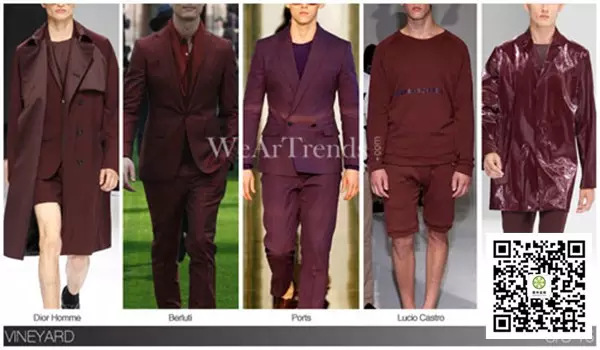 2015春夏男裝釋出色彩流行趨勢,其中有一個詞語可以概括:中性。無論是春天還是秋天,都保持著新的顏色,這些男性的色調(diào),包括靛藍、土褐色、藍色以及如同葡萄園一樣的紫紅色。這種超飽和的色調(diào)中有著另外一系列色彩,包括粉色等各種清新的亮色調(diào),與當代男裝的面料形成共鳴。不可否認,棕色已被分類為更主流的外套或者定制服裝、針織物種。經(jīng)過兩個賽季的發(fā)展,豐富的巧克力色以及榛子的色調(diào)深受大眾的喜愛,而2015春夏男裝色調(diào)植根于飽和色調(diào)的紅色調(diào)中。 干鼠尾草