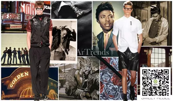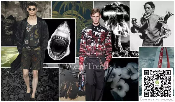 豐富的多汁葡萄酒圍繞著最近幾個賽季,它們已經(jīng)迅速過度到了更商業(yè)性的針織夾克中,在超飽和色調(diào)下,2015春夏的葡萄園則為更復雜的粉紅色和紫色融合中色調(diào)中?! ?/p> 2015春夏男裝主題的靈感 黑暗天堂 黑暗天堂是由海洋中過度而來,以明顯的方式表達出了這個主題的性質(zhì)及其驚人的力量。早期的沖浪文化,20世紀50年代的Tikikitsch提取顛覆性的一面,從著名藝術家RobertLongo險惡的世界末日中呈現(xiàn)而出的陰郁黑白照片得到靈感,黑暗的花香以及熔巖紋理成為了當季的主流。