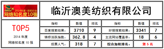 網(wǎng)絡知名度TOP5:臨沂澳美紡織有限公司