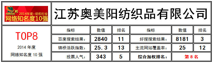 網(wǎng)絡知名度TOP8:江蘇奧美陽紡織品有限公司
