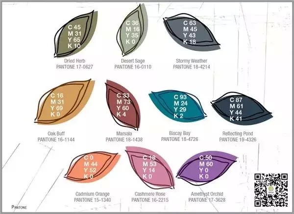 2015秋季流行色預(yù)測報(bào)告中,潘通公司列舉了10個(gè)顏色。除此之外,還有年度色號。今年是瑪莎拉色(Marsala)。往年的年度色號如下所示,從左到右為2014年到2008年依次遞減的年度色號。