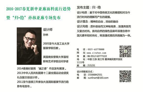 “2016-2017春夏新申亞麻面料流行趨勢(shì)暨‘歸·隱’孫林亞麻專場(chǎng)發(fā)布”與“新申杯•2015江蘇省十佳服裝設(shè)計(jì)師評(píng)比活動(dòng)”將于9月11日南京博覽服裝節(jié)和時(shí)尚創(chuàng)意周期間一同上演。