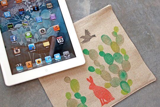 杰尼亞麻用亞麻布做成她的IPAD套子,在不到一天的時(shí)間內(nèi)完成了。真正使她分開的原因在于:它用手工雕刻裝飾郵票和顏料墨水裝飾,她用非常燙的熨斗將墨水染好色,這種方法只會對一些不經(jīng)常寫的東西有好處。否則她會使用專門為織物染色,如果你想制作你自己的郵票,可以看看她的一些教程,否則你可以查看可用的Etsy。試試這個最簡單的方法是使用一個大的橡皮來開始。