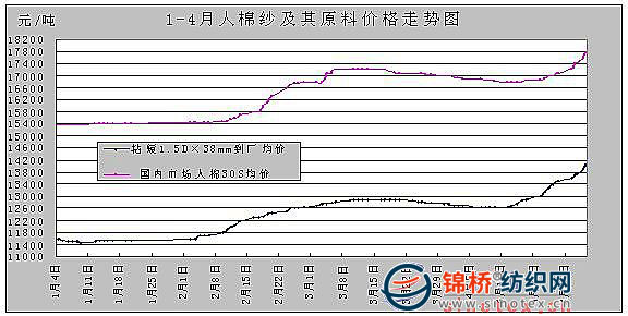 在經(jīng)歷40多天的靜如止水的行情之后,四月中下旬粘膠短纖價格開始迅速發(fā)力直線上漲,短短十天價格上漲近1400元/噸,而且這種漲勢還在持續(xù)。月末短纖價格已升至13000元/噸左右,而30S人棉紗也漲至18000元/噸。月末不少粘膠短纖廠家甚至供不應(yīng)求,有的甚至故意囤貨待漲,下游人棉紗及人棉布雖有跟漲,但幅度尤其是人棉坯布的遠遠小于短纖,這也造成下游廠家開始出現(xiàn)虧損,經(jīng)營利潤不但壓縮,但目前這種漲勢應(yīng)該還會持續(xù)一段時間。