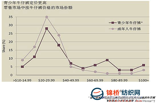 盡管價格在20至30美元的牛仔褲在市場上占到最大份額,根據(jù)美國棉花公司零售調查(Retail Monitor™)的數(shù)據(jù),青少年零售市場的牛仔褲價格比成年人的平均零售價格要高。青少年牛仔市場的高端產品中,價格從70至100美元以上的牛仔褲占青少年牛仔褲零售市場的21%。這個百分比顯然比成年人市場中精品牛仔褲的百分比6%要高出很多。青少年服飾零售商意識到青少年比成年消費者更愿意花費在服飾上,因此零售商期望通過牛仔產品把青少年重新吸引到商店中。為獲得更高的營業(yè)額,他們著重打造牛仔褲的款式,水洗效果,提供更多面料選擇,同時也提供更廣闊的價格空間供消費能力不同的青少年選擇。