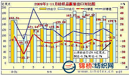 據(jù)海關(guān)公布的數(shù)據(jù),2009年11月,紡織品服裝出口總值為139.6億美元,下降9.5%。其中紡織品出口53.66億美元,增長7.4%,服裝出口85.93億美元,下降17.6%。 11月,紡織品服裝出口環(huán)比10月份下降4.7%,其中紡織品增長1.4%,服裝下降8.2%。