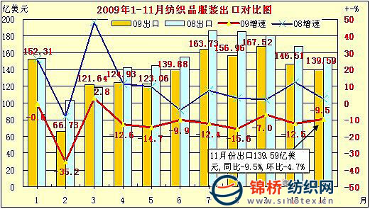 1.11月紡織服裝出口同比、環(huán)比繼續(xù)下降,紡織品出口首次正增長。據(jù)海關統(tǒng)計,11月全國紡織服裝出口139.59億美元,同比減少14.65億美元,下降9.5%,環(huán)比下降4.7%。其中服裝出口85.93億美元,同比減少18.48億美元,下降17.7%,環(huán)比下降8.2%;紡織品出口53.66億美元,同比增長7.4%,2009年首次正增長,環(huán)比上升1.4%。1-11月紡織服裝出口1502.85億美元,同比下降11.2%,其中紡織品出口537.76億美元,同比下降11%,服裝出口965.09億美元,同比下降11.2%。