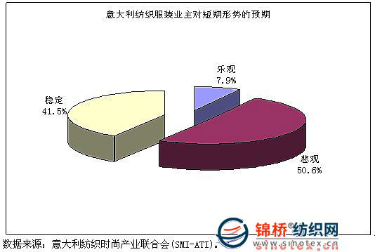 據(jù)SMI-ATI于11月所作抽樣調(diào)查結(jié)果顯示,紡織服裝企業(yè)主對短期內(nèi)經(jīng)濟(jì)形勢信心不足,對未來預(yù)期擔(dān)憂加劇。在調(diào)查企業(yè)中,50.6%的企業(yè)對未來表示悲觀,41.5%的企業(yè)認(rèn)為仍然將保持穩(wěn)定,他們盡管對短期金融危機(jī)大環(huán)境影響下外部形勢表示憂慮,但是有信心利用“意大利制造”競爭優(yōu)勢(如產(chǎn)品創(chuàng)新、產(chǎn)品多樣化、分銷加強(qiáng)戰(zhàn)略等)現(xiàn)有資源度過難關(guān)。在調(diào)查企業(yè)中僅7.9%的企業(yè)持樂觀態(tài)度。