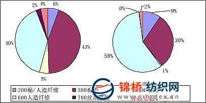 數(shù)據(jù)來源:OTEXA 2009年我國出口美國紡織品有所下降,服裝類產(chǎn)品數(shù)量金額全面增長。同時中國出口美國紡織品服裝類產(chǎn)品占美國市場份額顯著提升。和2008年相比我國服裝出口美國數(shù)量和金額占比分別上升6.13個百分點和5.21個百分點。紡織品出口數(shù)量和金額占比分別上升1.5個百分點和1個百分點。 分析這些數(shù)字,可以看出我國服裝出口產(chǎn)品在美國市場還是具有相當(dāng)競爭力的。靠服裝市場需求拉動,我國服裝出口美國無論是數(shù)量、金額還是占比都在提升。美國本土服裝生產(chǎn)現(xiàn)今已經(jīng)所剩不多,就使得其對紡織品需求有所下降,直接影響到我國紡織品出口增長。這是美國自身產(chǎn)業(yè)結(jié)構(gòu)調(diào)整的1個大趨勢。 化纖和棉類產(chǎn)品為主 從我國紡織品服裝出口美國主要大類產(chǎn)品來看,人造纖維類產(chǎn)品一枝獨秀。數(shù)量和金額都位列第1,2009年出口數(shù)量達120.53億件,同比增長1.10%;金額達129.41億美元,同比下降3.90%。棉類產(chǎn)品出口數(shù)量和金額位于第2位,數(shù)量61.58億件,同比下降1.29%;金額142.36億美元,同比增長8.13%。毛質(zhì)和絲質(zhì)產(chǎn)品由于價格相對較高,受全球消費緊縮的影響,出口數(shù)量明顯減少。2009年出口美國各大類產(chǎn)品數(shù)量和金額占比如下圖: