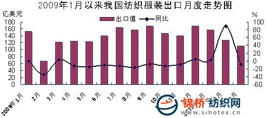 一、2010年以來月度出口額逐月下降。2009年12月我國(guó)紡織服裝單月出口額回升至167.8億美元,創(chuàng)2009年以來月度出口最高值。2010年以來月度出口額逐月下降,其中3月當(dāng)月出口110億美元,同比下降9.5%,環(huán)比下降12.9%(下圖)。