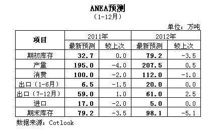 鑒于近期苗情發(fā)展不樂(lè)觀,2011年產(chǎn)量明顯調(diào)低(較上次低4萬(wàn)噸);受國(guó)際棉價(jià)大幅下跌影響,2012年的產(chǎn)量也隨之調(diào)低。由于產(chǎn)量的減少幅度大于消費(fèi)量的減少幅度,所以年末庫(kù)存也低于先前的預(yù)測(cè)(2011和2012年末庫(kù)存分別減少3.5萬(wàn)噸和5.1萬(wàn)噸)。