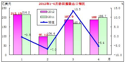 海關(guān)總署最新數(shù)據(jù)顯示,紡織服裝在3月份出現(xiàn)小幅反彈后,4月份再度出現(xiàn)下滑。2012年4月,我國出口紡織品服裝約188億美元(與3月份基本持平),同比下降5.4%。其中出口紡織紗線、織物及制品84.06億美元,同比下降4.12%,出口服裝及衣著附件103.94億美元,同比下降6.42%。 2012年1-4月,紡織品服裝累計出口688.14億美元,同比增加0.48%,增速較一季度回落2.38點。其中紡織紗線、織物及制品出口288.19億美元,同比下降0.3%,一季度微增1.38%;服裝及衣著附件出口399.65億美元,同比微增1%,增速較一季度回落2.91點。