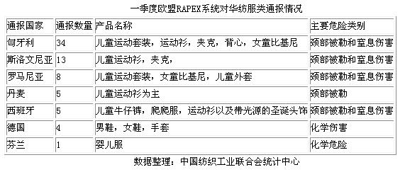 今年一季度,我國紡織品服裝出口歐盟金額累計同比下降8.14%,同期,歐盟對我紡織服裝類產(chǎn)品發(fā)出召回數(shù)量猛增337.5%。一降一增顯示出我國紡織服裝類產(chǎn)品出口歐盟的形勢嚴(yán)峻。 聯(lián)合國在2012年初發(fā)布的《2012年世界經(jīng)濟形勢與展望》報告指出,在經(jīng)濟緊縮政策和部分歐洲國家主權(quán)債務(wù)危機影響下,2012年歐洲經(jīng)濟形勢將繼續(xù)嚴(yán)峻。今年以來歐洲各國相繼出臺措施希望可以提振經(jīng)濟。比如,2月29日歐洲央行推行第二輪LTRO(長期再融資計劃)欲緩解債務(wù)危機,穩(wěn)定歐元區(qū)金融市場,但并不能有立竿見影的效果。 出口增速持續(xù)下滑 據(jù)中國海關(guān)統(tǒng)計,今年1~3月,我國紡織品服裝出口至歐盟的金額為97.16億美元,同比下降8.14%。其中紡織品出口28.90億美元,同比下降3.89%;服裝出口68.26億美元,同比下降9.82%。3月單月我國出口歐盟紡織品11.01億美元,同比下降1.70%,環(huán)比上升94.85%;服裝出口19.48億美元,同比增長7.15%,環(huán)比上升72.95%。 雖然從3月單月出口速度看,與去年同期和上月相比均有所回升,但從總的趨勢看,我國紡織品服裝出口歐盟正持續(xù)下滑。 事實上,從去年三季度以來歐洲經(jīng)濟增長就不斷走低,失業(yè)率加劇,不僅直接影響家庭收入,而且加大了財政和社會保險、失業(yè)救助負擔(dān),延緩結(jié)構(gòu)改革步伐。同時也導(dǎo)致歐盟成員國的最終消費萎縮。受此影響,從2011年7月開始,歐洲自華進口紡織服裝產(chǎn)品速度也出現(xiàn)大幅放緩,并逐步陷入收縮態(tài)勢。此趨勢延續(xù)至今年,2月我國對歐盟服裝出口甚至還出現(xiàn)了去年以來的最低谷,雖3月單月服裝出口數(shù)據(jù)顯示今年以來的下滑勢頭似有企穩(wěn)反彈的跡象,但總趨勢仍不容樂觀。 對華通報數(shù)量猛增 今年一季度我國對歐盟服裝出口形勢不樂觀,與此同時,歐盟RAPEX系統(tǒng)對我國出口服裝的召回數(shù)量卻在迅猛增長,此趨勢應(yīng)引起出口企業(yè)的高度重視。 據(jù)中國紡織工業(yè)聯(lián)合會統(tǒng)計,2012年一季度,歐盟RAPEX系統(tǒng)共發(fā)布產(chǎn)品通報531項,比2011年同期的299項同比增長77.59%。其中,對華產(chǎn)品通報317項(不包括對臺灣地區(qū)和香港地區(qū)的通報),占同期歐盟通報總數(shù)的59.70%,比上年同期增長112.75%,高居被通報國首位。這其中,對華紡織服裝類產(chǎn)品通報70項,占對華通報總數(shù)的22.08%,同比增長337.5%,增長十分迅猛。