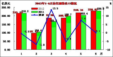 據海關統(tǒng)計,今年上半年,我國外貿進出口總值18398.4億美元,同比(下同)增長8%。其中出口9543.8億美元,增長9.2%;進口8854.6億美元,增長6.7%;貿易順差689.2億美元,擴大56.4%。6月份當月,我國進出口總值3286.9億美元,同比增長9%。其中出口1802.1億美元,增長11.3%;進口1484.8億美元,增長6.3%;貿易順差317.3億美元,擴大42.9%。 6月份,紡織服裝出口228.87億美元,同比微降0.1%,環(huán)比上升4.8。其中紡織紗線、織物及制品出口84.08億美元,同比微增0.6%,環(huán)比下降8.9%;服裝及附件出口144.79億美元,同比微降0.4%,環(huán)比上升14.8%。今年上半年,紡織服裝出口1135.22億美元,同比微增1.6%(遠低于全國其他商品出口10.3%的增速)。其中紡織464.76億美元,增長1.3%,服裝670.46億美元,增長1.9%。