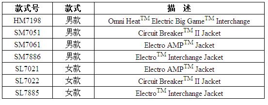 此次被召回的2012秋季款哥倫比亞電熱沖鋒衣分男款和女款,聚酯纖維材質(zhì),“Columbia”標(biāo)在衣服正面左邊,衣服內(nèi)部有兩塊電池組,款式號標(biāo)在白色警示標(biāo)簽上。具體的款式號及描述分別為: