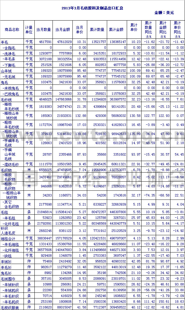 錦橋紡織網(wǎng)—資訊頻道> 外貿(mào)信息>正文 2013年3月毛紡原料及制品出口匯總