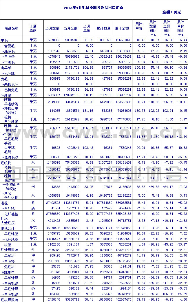 2013年4月毛紡原料及制品出口匯總
