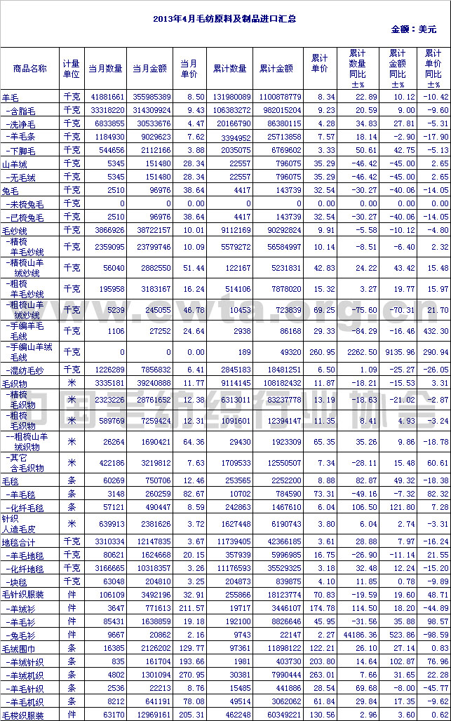 2013年4月毛紡原料及制品進(jìn)口匯總