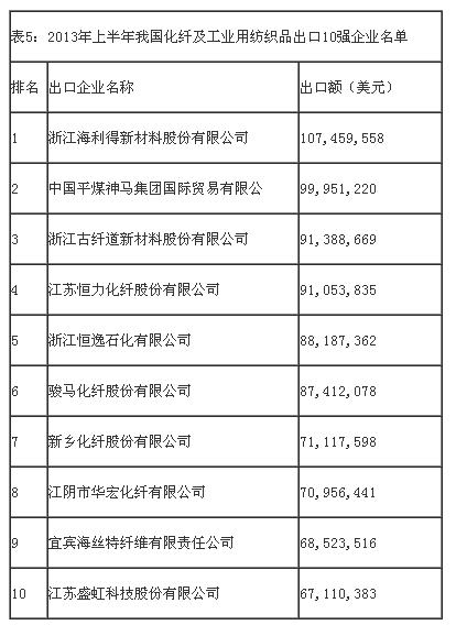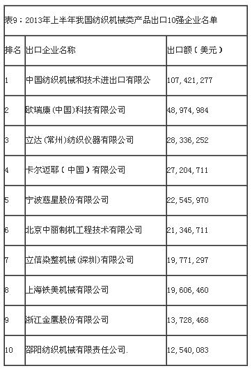 從出口企業(yè)情況來看,我國紡織機(jī)械類產(chǎn)品出口集中度相對集中,出口額排名前10位企業(yè)出口額合計(jì)占同期我國紡織機(jī)械類產(chǎn)品出口總額的27.3%。今年第一季度出口10強(qiáng)企業(yè)名單如表9: