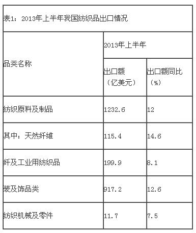 據(jù)海關(guān)信息網(wǎng)數(shù)據(jù)顯示,今年上半年我國共出口紡織原料及制品1232.6億美元,比去年同期增長12%。其中,天然纖維類產(chǎn)品[1]出口115.4億美元,比去年同期增長14.6%;化纖及工業(yè)用紡織品類產(chǎn)品[2]出口199.9億美元,比去年同期增長8.1%;服裝及飾品類產(chǎn)品[3]出口917.2億美元,比去年同期增長12.6%。另外,第一季度我國紡織機(jī)械產(chǎn)品[4]出口額為11.7億美元,比去年同期增長7.5%(詳見表1)。