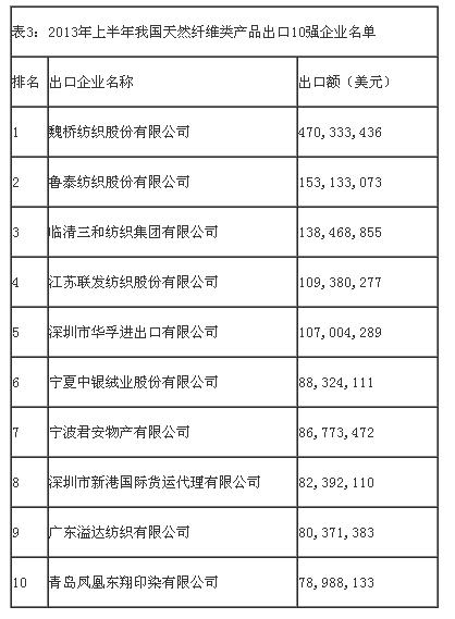| 表2:2012年上半年我國天然纖維類產(chǎn)品出口額排名前15位品種出口情況 |